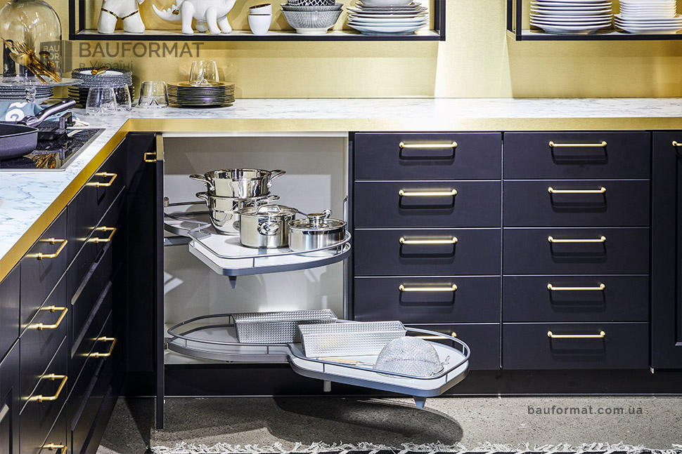 Фасад має всі атрибути класичної кухні, при цьому не поступається функціональністю кухням в сучасному стилі.